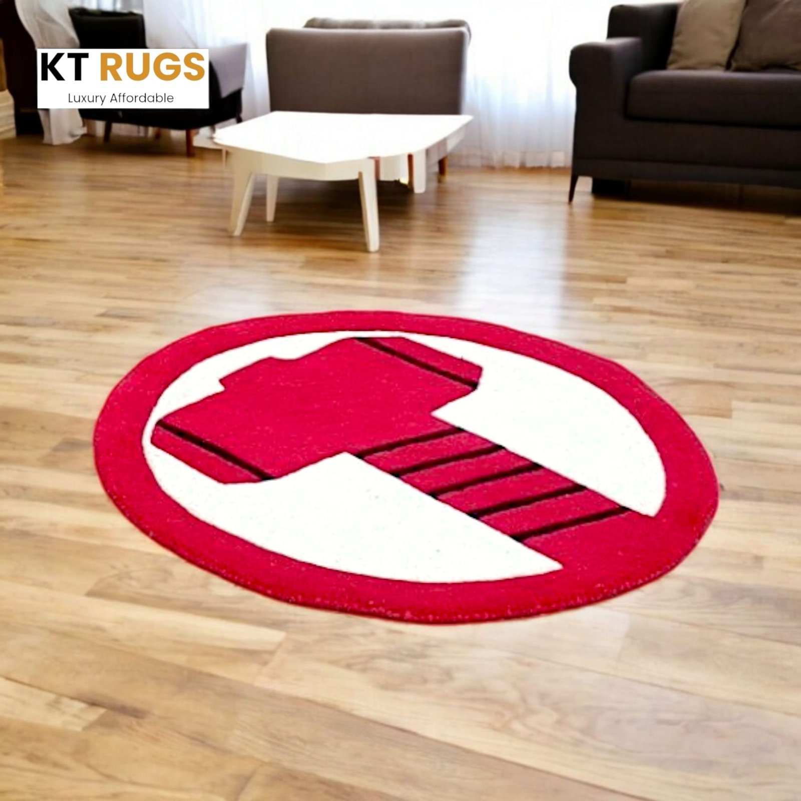 Inspired by Scandinavian minimalism and Norse symbolism, this rug transforms ancient mythology into modern art. The crimson Mjölnir represents protection and strength, while the circular form embodies harmony.